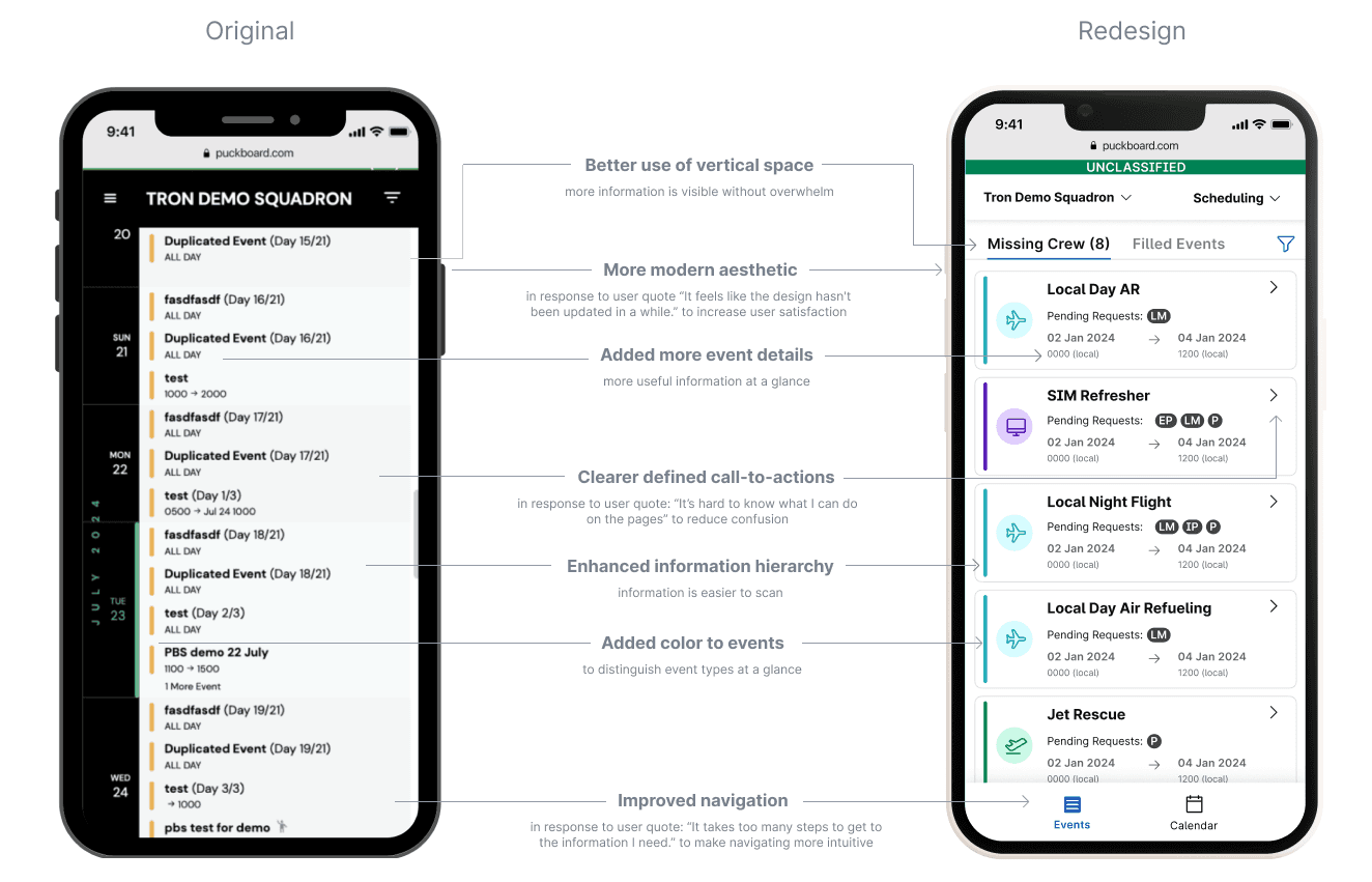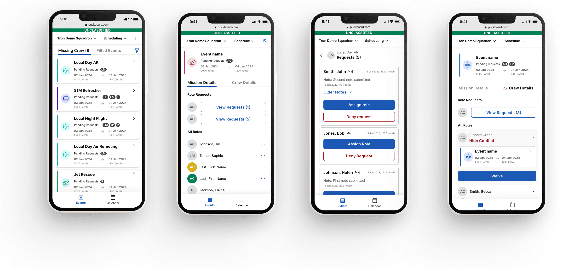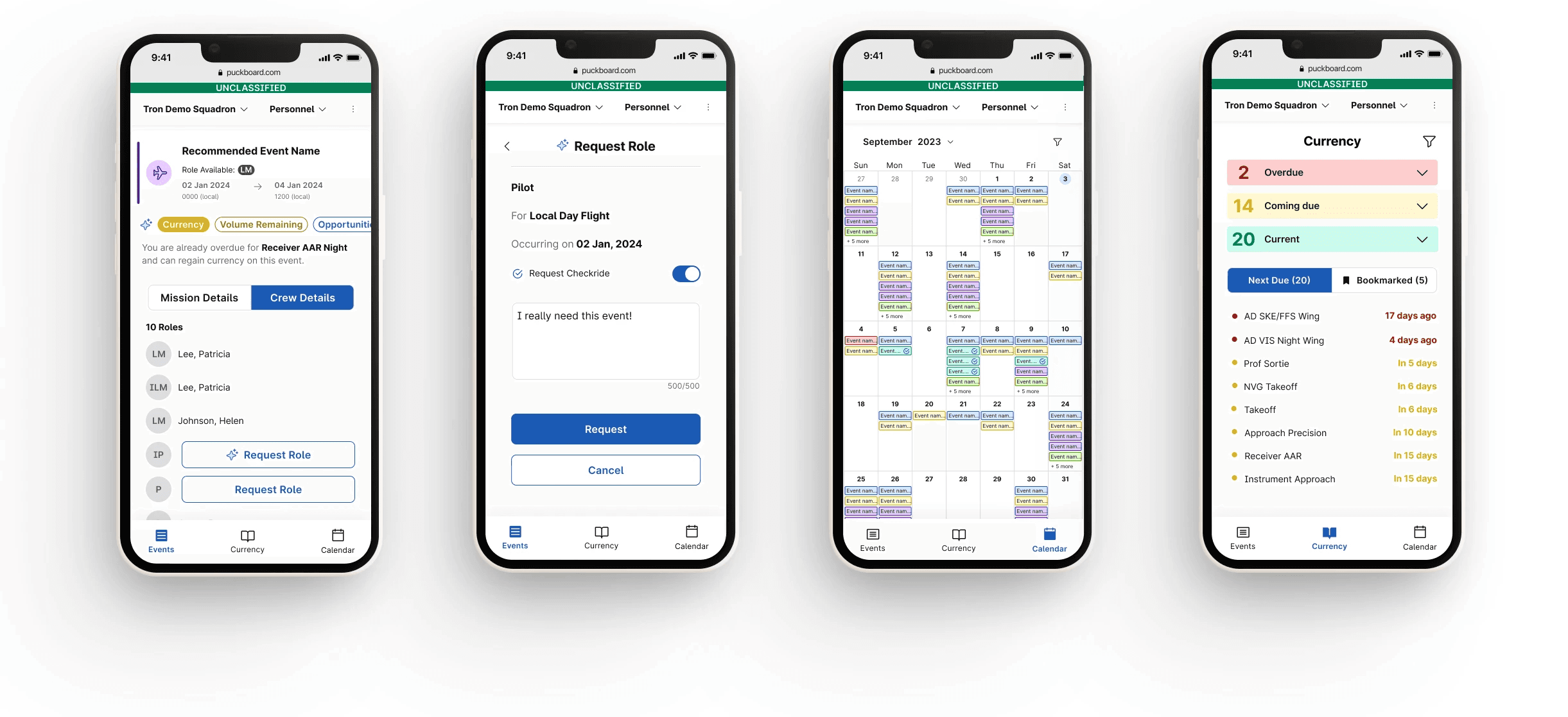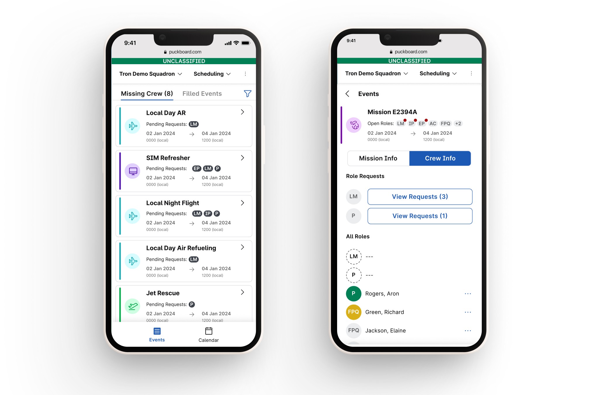 The U.S. Air Force flies missions to respond quickly to threats, support ground forces, and carry out important tasks like rescue operations. Squadrons have tedious, manual processes to schedule missions, involving referencing whiteboards, physical papers, and multiple outdated websites. More time spent scheduling means less time in the skies. Puckboard is a 6,000+ monthly user digital platform that mitigates aircrew frustrations with one simple and intuitive experience so they can focus on flying.