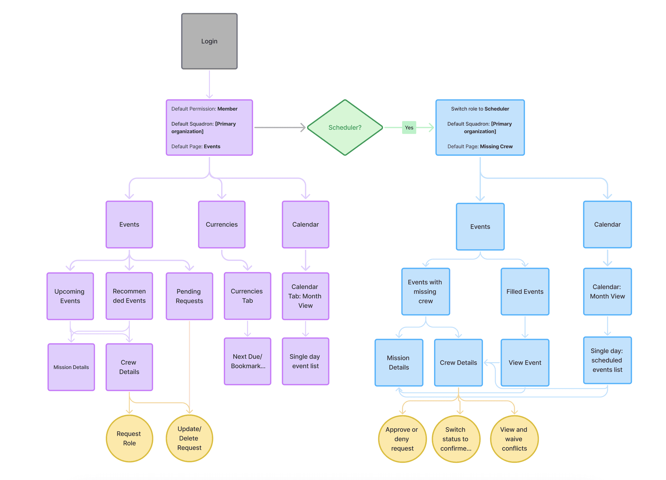 I created a user flow to map out the steps users would take to navigate pages based on their role as an aircrew member (pilots, loadmasters) or mission scheduler. Defaulting to the member view instead of scheduler allows squadron members to carry out their main tasks more quickly on the go as schedulers use desktop to plan out missions.