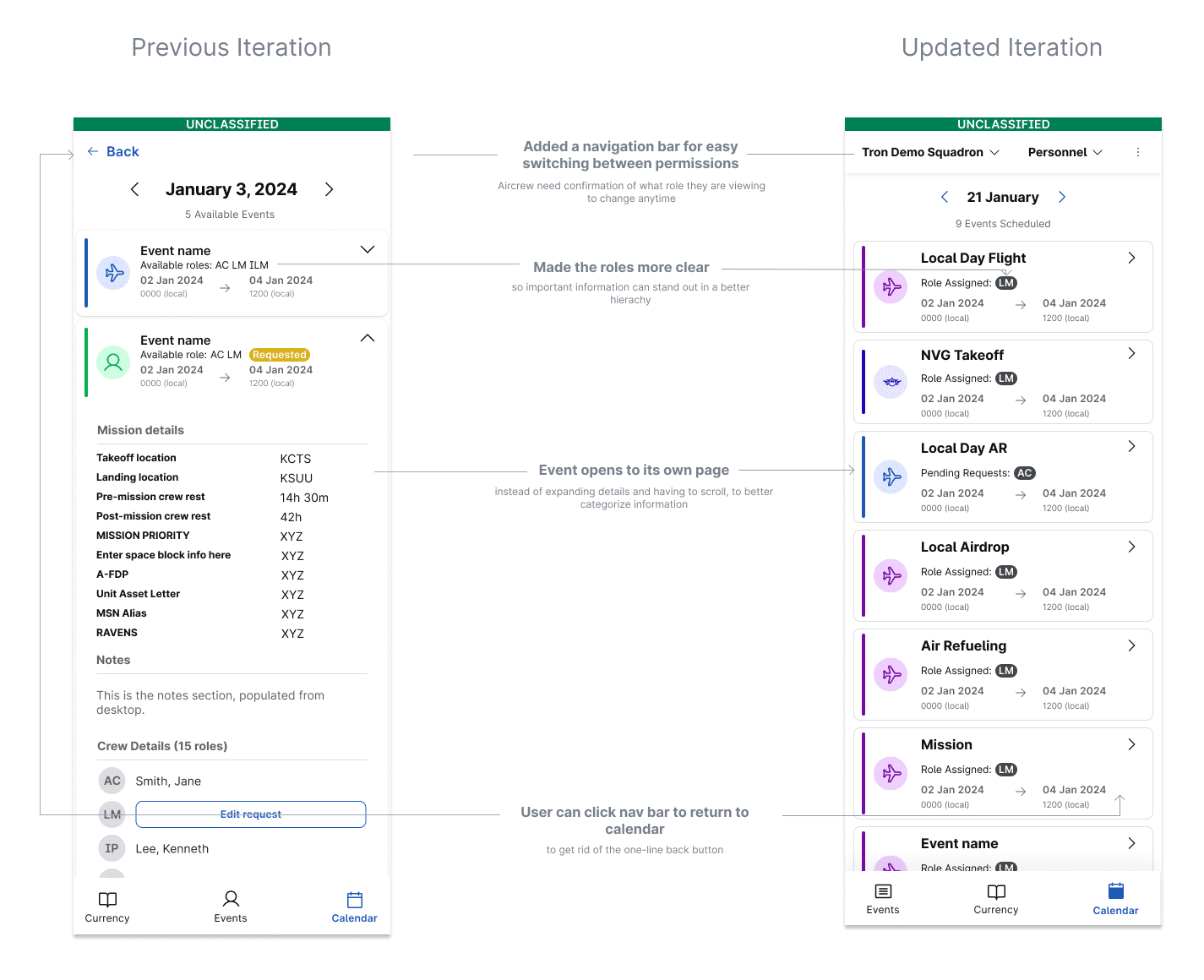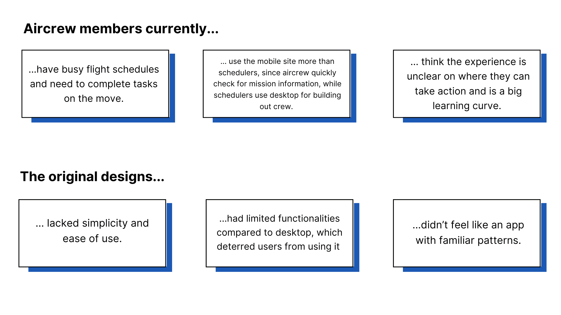 Several US Air Force squadrons were interviewed through online calls and they shared similar insights and frustrations with the mobile experience. I then concluded their pain points from a design perspective:
